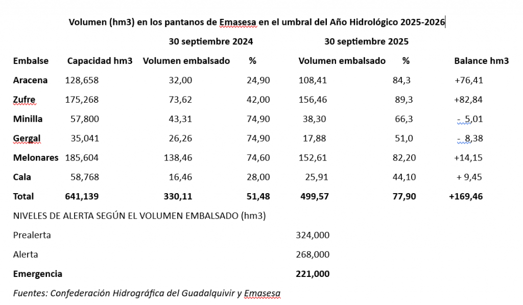 Al comienzo del Año Hidrológico 2024-2025 los seis pantanos que componen el sistema de abastecimiento de la empresa metropolitana de aguas, Emasesa, tenían embalsada agua que apenas suponía un punto y medio por encima de la mitad de su capacidad.