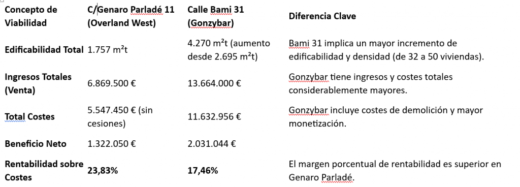 El promotor de la calle Bami, 31, en cambio, utiliza el Módulo Base Oficial ajustado de 499,07 €/m² para monetizar sus cesiones, un valor significativamente inferior. Esto implica que, aunque en Bami, 31 se proyecta vender más caro (4.000 €/m² vs 3.500 €/m²) y tiene un volumen total de costes mucho mayor, el valor unitario que utiliza para calcular su obligación con la comunidad es menor que el valor residual que el promotor de Genaro Parladé,11 utiliza para sí mismo.