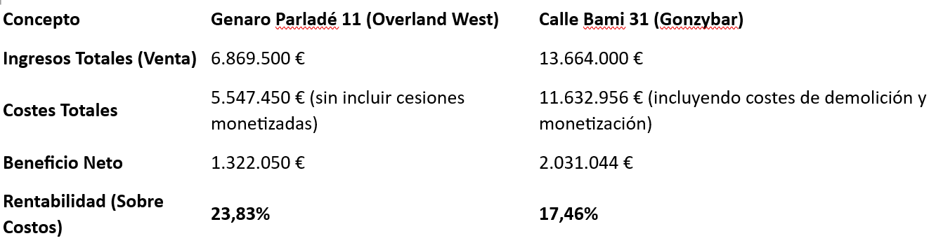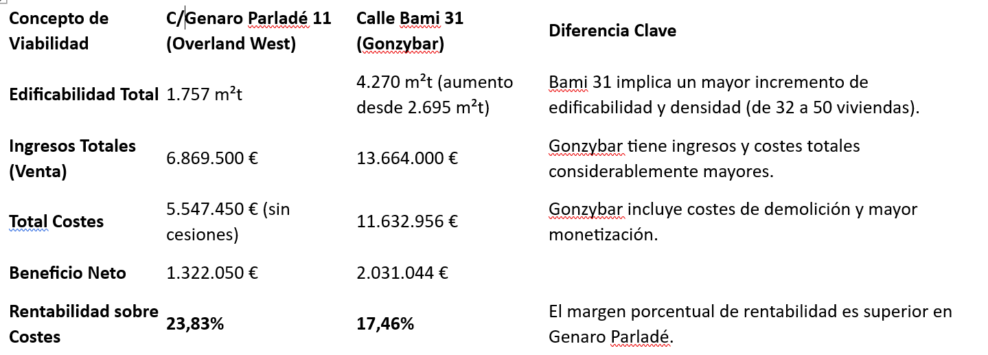 El promotor de la calle Bami, 31, en cambio, utiliza el Módulo Base Oficial ajustado de 499,07 €/m² para monetizar sus cesiones, un valor significativamente inferior. Esto implica que, aunque en Bami, 31 se proyecta vender más caro (4.000 €/m² vs 3.500 €/m²) y tiene un volumen total de costes mucho mayor, el valor unitario que utiliza para calcular su obligación con la comunidad es menor que el valor residual que el promotor de Genaro Parladé,11 utiliza para sí mismo.