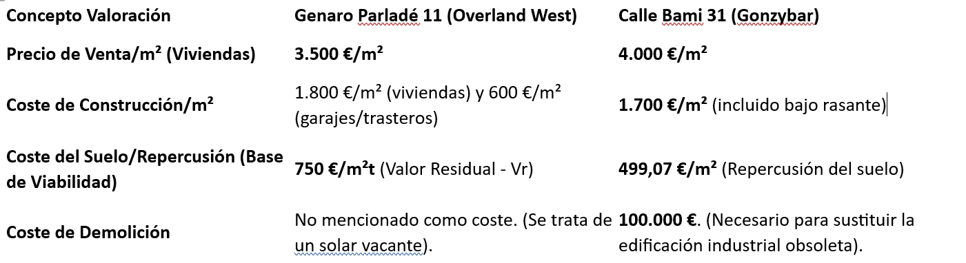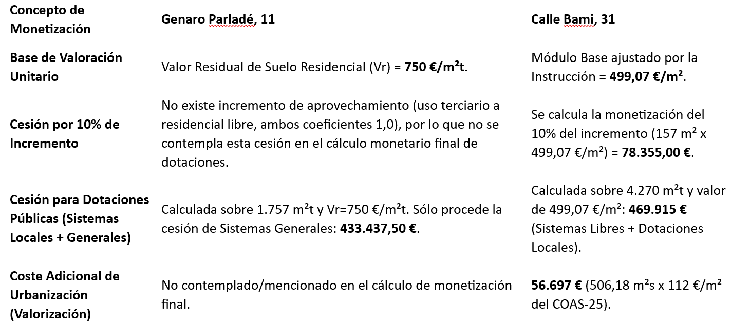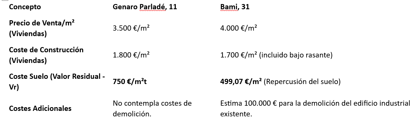 La diferencia clave en las valoraciones para alcanzar la rentabilidad y cumplir los deberes urbanísticos radica en la base del valor del suelo (Repercusión/Valor Residual) utilizada: el promotor de Genaro Parladé, 11 utiliza un valor de 750 €/m²t, mientras que el de Bami, 31 utiliza 499,07 €/m² para el suelo, lo que afecta directamente tanto a la viabilidad de la promoción como al importe final de la monetización de las cesiones.