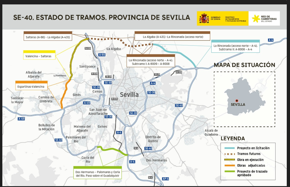 Además, el tramo del sector noroeste del anillo hacia el norte (el tramo Valencina-Salteras está en ejecución; y el tramo Espartinas-Valencina cuenta ya con las obras adjudicadas por más de 84 millones de euros. Respecto al tramo de la SE-40 a su paso por la Rinconada (Acceso norte – A-4), la redacción del proyecto está en licitación.