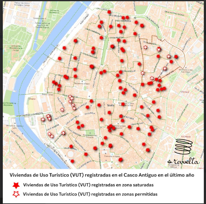 Hace un año entraba en vigor la limitación de viviendas de uso turístico aprobada por el Ayuntamiento de Sevilla que situaba en un máximo del 10% de estos alojamientos respecto a los residenciales. Tal y como denunció en su momento, la asociación vecinal ‘La Revuelta’ estima que aquella regulación fue “una oportunidad perdida para hacer frente al proceso de turistización desenfrenado de la ciudad”.