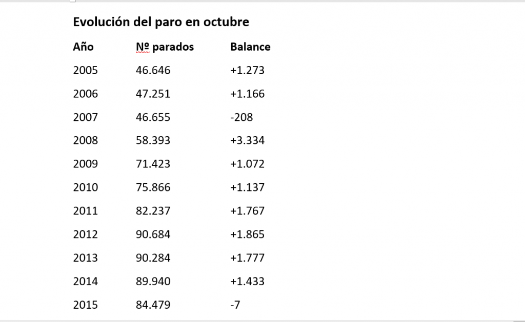 En el resto de ejercicios siempre subió el paro en el mes de octubre, con el pico máximo en 2008, el año del estallido de la burbuja inmobiliaria, cuando 3.334 personas acabaron en el desempleo. Entre 2005 y 2014 hubo ocho meses de octubre más en que se registró un incremento en más de un millar del número de parados.