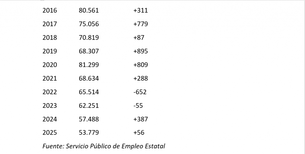 El balance interanual, de octubre de 2024 a octubre de 2025, refleja una reducción del número de parados en 3.669 personas (se ha pasado de 57.448 a 53.779), una caída del 76,38% en doce meses.