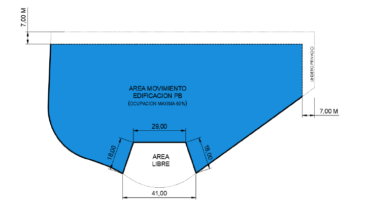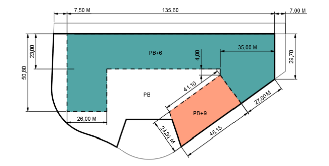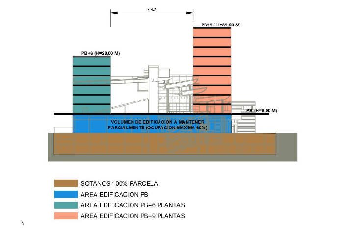 De la misma forma, se prevé mantener parcialmente la edificación existente en planta baja de comercio (PB+8.00m) hasta una ocupación máxima del 60% del suelo y establecer una edificación en altura sobre dicho basamento.