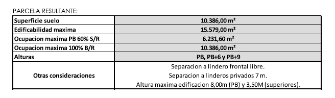 marcadas en el PGOU por la dificultad de materialización de los nuevos usos terciarios proyectados. La propuesta propone situar la edificación escalonada con una zona de PB+6 y otra de PB+9 (bajo más seis plantas y bajo más nueve plantas, respectivamente).