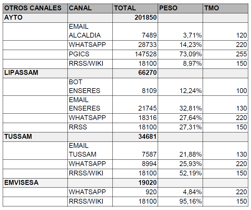 TMO (Tiempo Medio Operativo, se supone que en segundos); PGICS ( Plataforma de Gestión Integral Ciudad de Sevilla); RSS/WIKI (Redes Sociales más Wikipedia); BOT (robot o asistente virtual)