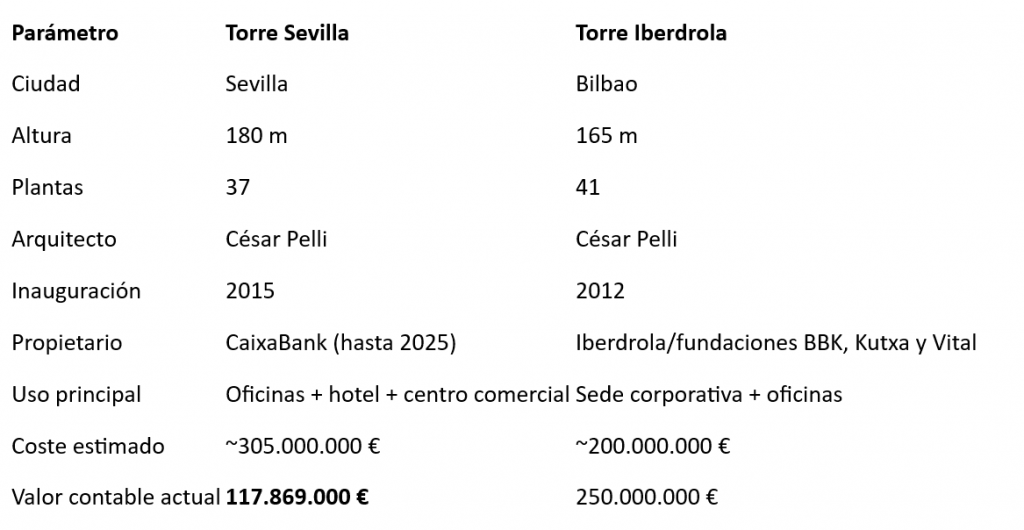 El valor contable es el que otorga Caixabank a su participación en Puerto Triana, su filial dueña de torre Sevilla, mientras que el valor de la torre Iberdrola es una estimación del año 2021, cuando Kutxabank puso a la venta sus acciones en la sociedad dueña de la misma