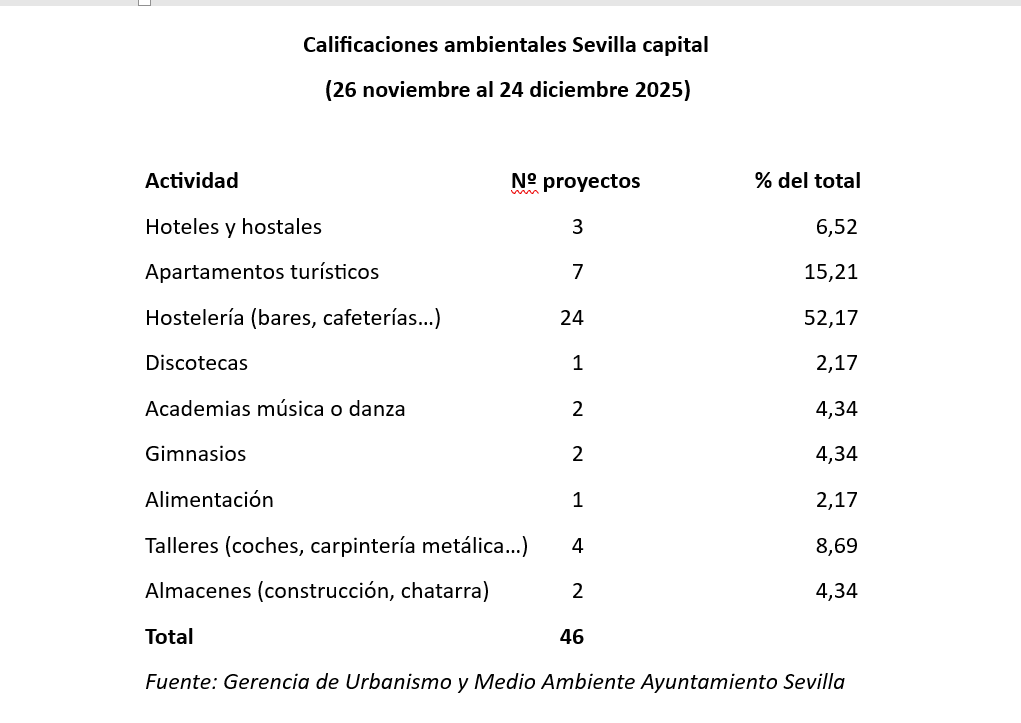 El 80% de los proyectos empresariales cuya calificación ambiental ha sido sometida a información pública corresponden a los sectores de hostelería, turismo y ocio, en línea con la tendencia habitual en la capital de Andalucía.