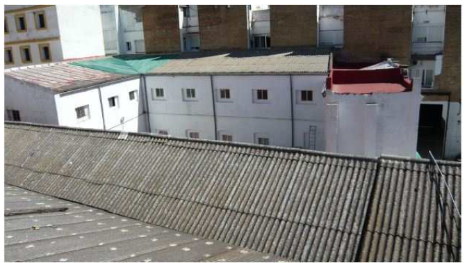 Otra parte del informe se centra en la cubierta de las edificaciones. Las imágenes aéreas y de detalle muestran tejados de chapas metálicas y fibrocemento en un estado de conservación meramente funcional, sin elementos de interés arquitectónico. Asimismo, se observan múltiples unidades de aire acondicionado instaladas en los muros exteriores, lo que subraya la pérdida de la tipología industrial original del periodo de construcción.