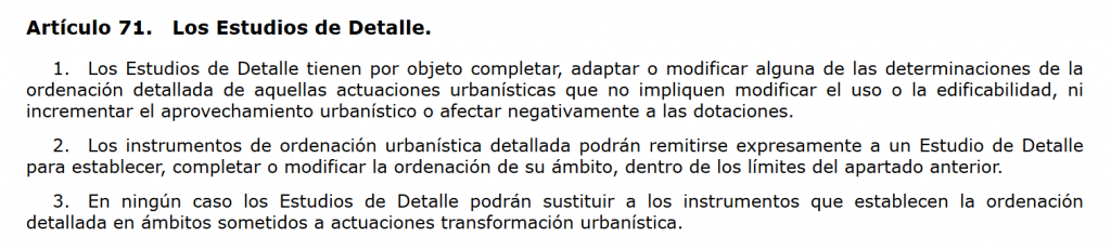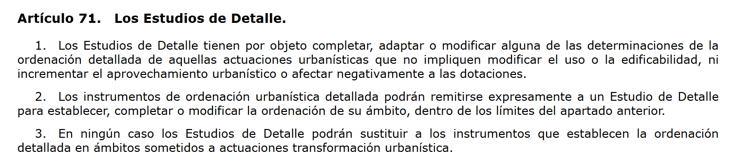 La LISTA, en su artículo 71, define que el objeto de un Estudio de Detalle es completar, adaptar o modificar determinaciones de la ordenación detallada.