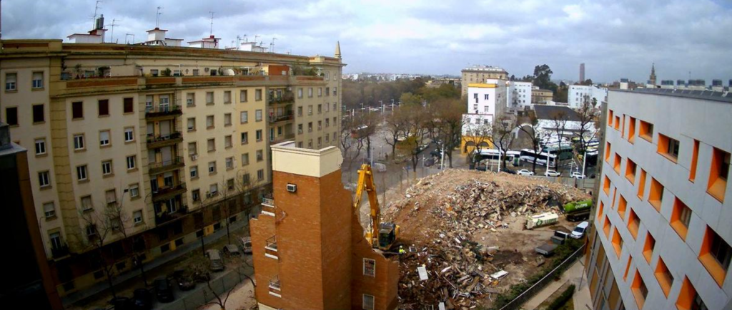 La parcela, de 1.945 m2 de superficie en números redondos, se encuentra dentro del Conjunto Histórico declarado de la ciudad de Sevilla y estuvo ocupada por un inmueble construido en el año 1955 que constaba de 21 viviendas (4.900 m2 edificados en total) y que fue declarado en estado de ruina física en ciernes debido a problemas estructurales graves (asientos y desplomes severos detectados desde 2022).