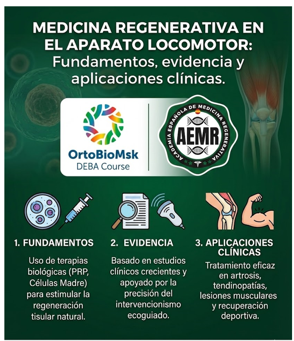 La medicina regenerativa aplicada al aparato locomotor ha experimentado un crecimiento exponencial en los últimos años. Terapias como el plasma rico en plaquetas (PRP), el aspirado de médula ósea (BMAC), las células mesenquimales del tejido adiposo, así como su combinación con técnicas de intervencionismo ecoguiado, están cambiando el paradigma terapéutico en patologías degenerativas, tendinopatías crónicas, lesiones musculares, articulares y ligamentarias.