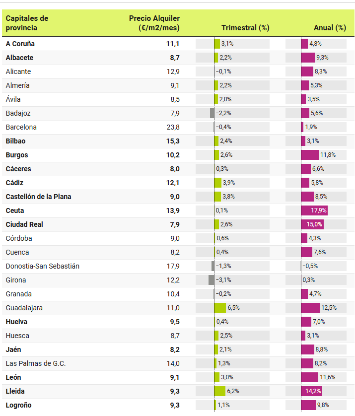 Todas las provincias españolas registran precios del alquiler más elevados que hace un año con una excepción: Girona, donde se han reducido un 1,5%. El mayor incremento se ha registrado en Lleida, donde los precios ascendieron un 16,4%. También han sido relevantes las subidas registradas en Ciudad Real (14,8%), Guadalajara (14,8%), Burgos (12,5%) y Segovia (12,4%). En Madrid se han encarecido un 10,4%, mientras que en la provincia de Barcelona se ha quedado en un 2,5%.