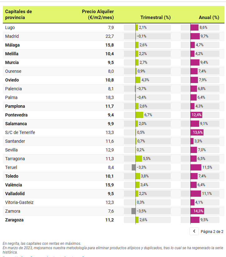 Barcelona es la capital más cara para alquilar una vivienda, con 23,8 euros/m2, seguida por Madrid (22,7 euros/m2) y Palma (18,3 euros/m2). En cuarto lugar, se sitúa San Sebastián (17,9 euros/m2) y a continuación están Valencia (15,9 euros/m2) y Málaga (15,8 euros/m2). En la parte baja de la tabla encontramos a Zamora (7,6 euros/m2), Ciudad Real, Badajoz y Lugo (7,9 euros/m2 en los 3 casos).