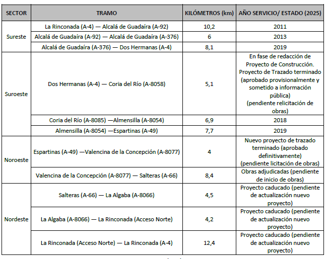Tramos que componen la autovía SE-40, su longitud y la fase en la que se encuentran, actualizados a la fecha de redacción del proyecto del enlace al Copero