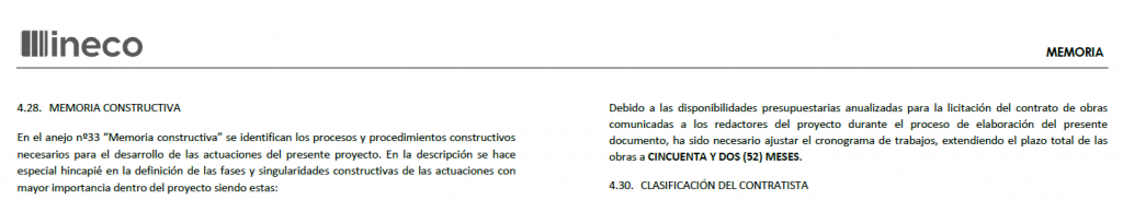 Sin embargo, el documento se cambió posteriormente, de esta manera: «Debido a las disponibilidades presupuestarias anualizadas para la licitación del contrato de obras comunicadas a los redactores del proyecto durante el proceso de elaboración del presente documento, ha sido necesario ajustar el cronograma de trabajos, extendiendo el plazo total de las obras, a CINCUENTA Y DOS (52) MESES».