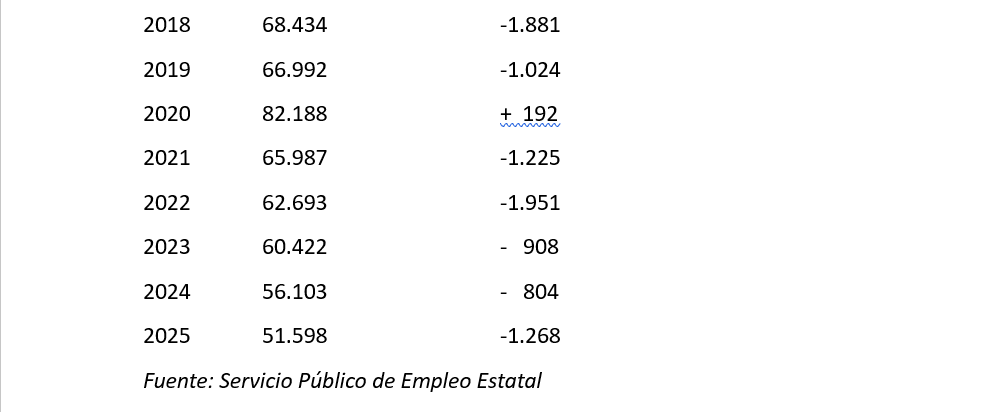 El balance interanual, de diciembre de 2024 a diciembre de 2025, es de 4.505 parados menos (se ha pasado de 56.103 a 51.598), lo que supone un -8,02%.