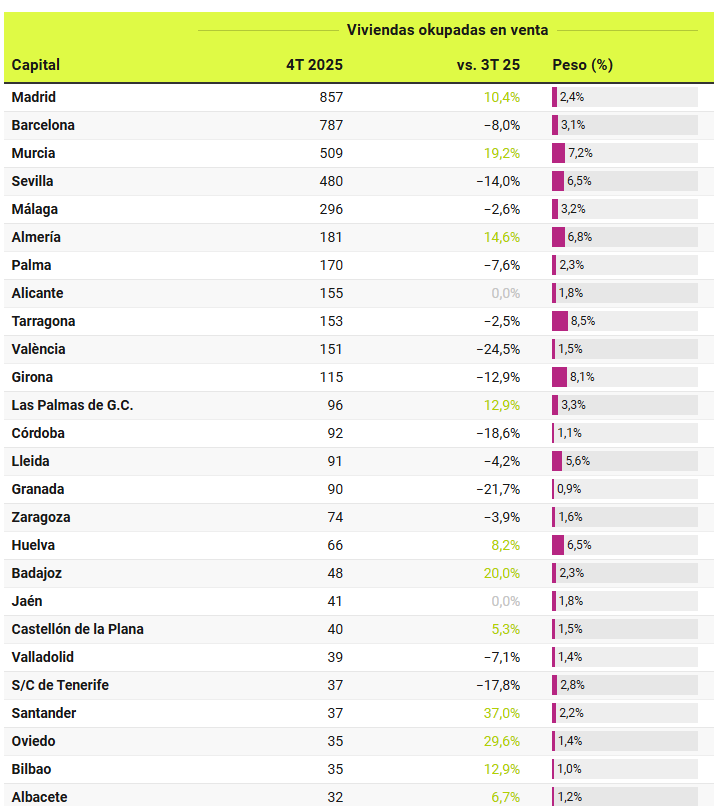 Los mercados más grandes tienen un mayor número de viviendas sin posesión en el mercado de venta. La ciudad de Madrid lidera este ranking con 857 viviendas okupadas a la venta durante el cuarto trimestre de 2025, seguida por Barcelona con 787 viviendas en el mismo periodo. Murcia (509) se sitúa en tercera posición, seguida por Sevilla (480 viviendas), Málaga (296 viviendas), Almería (181 viviendas), Palma (170 viviendas) y Alicante (155 viviendas). Solo estas 8 capitales reúnen el 69% de todas las viviendas okupadas en venta de las capitales españolas.