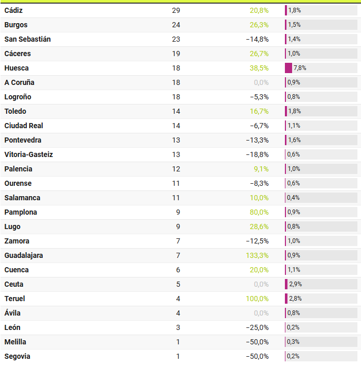 Tras Soria, que no tiene, Segovia y Melilla, con 1 vivienda sin posesión a la venta en cada una, son las capitales españolas con menos oferta en esta situación, seguidas por León (3 viviendas), Ávila (4), Teruel (4) y Ceuta (5)