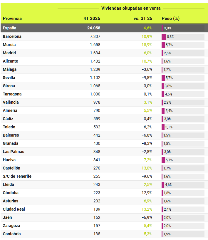 Barcelona es la provincia en la que más pesan las viviendas okupadas en el mercado de venta, ya que el 8,3% de toda la oferta en la misma está en esta situación. Le siguen las provincias de Sevilla (5,7%), Huelva (5,7%), Murcia (5,7%) y Almería (5,4%). Con una tasa superior a la media nacional están también las provincias de Toledo (5,1%), Lleida (4,6%), Tarragona (4,6%) y Girona (3,8%). En Madrid, la tasa se encuentra en el 2,6%.
