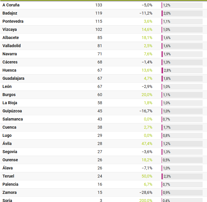 En el caso de las provincias la situación es muy similar, con Barcelona como la que tiene un mayor volumen de casas okupadas en el mercado: 7.307 viviendas. Le siguen Murcia (1.658 viviendas), Madrid (1.634 viviendas), Alicante (1.402 viviendas), Málaga (1.209 viviendas), Sevilla (1.102 viviendas), Girona (1.068 viviendas) y Tarragona (1.000 viviendas), las únicas con más de 1.000 unidades. En el lado opuesto está la provincia de Soria, con solo 3 viviendas, y tras ella se sitúan Zamora (15 viviendas), Palencia (16 viviendas) y Teruel (24 viviendas).