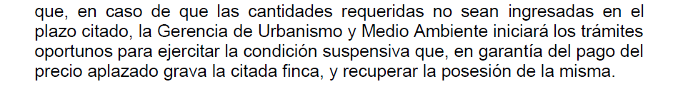 Como garantía del pago del precio aplazado y con eficacia real, la transmisión quedó sujeta a condición suspensiva por plazo de 25 años (aunque el delegado y el gerente rebajan la cifra a 20 años en la propuesta elevada al Consejo de Gerencia), siendo suficiente para su cancelación, acuerdo de la Gerencia de Urbanismo autorizándola, que acredite el pago del precio aplazado y los intereses devengados.