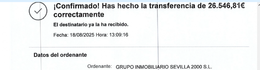La deuda por 26.546,81 euros es satisfecha a la Gerencia de Urbanismo el 18 de agosto de 2025 pero no por la deudora, ni siquiera por su representante en su nombre, ni tampoco por la pareja de particulares que había firmado el contrato de arras, sino por el Grupo Inmobiliario Sevilla 2000, tal como acredita el documento justificativo de la transferencia bancaria realizada: