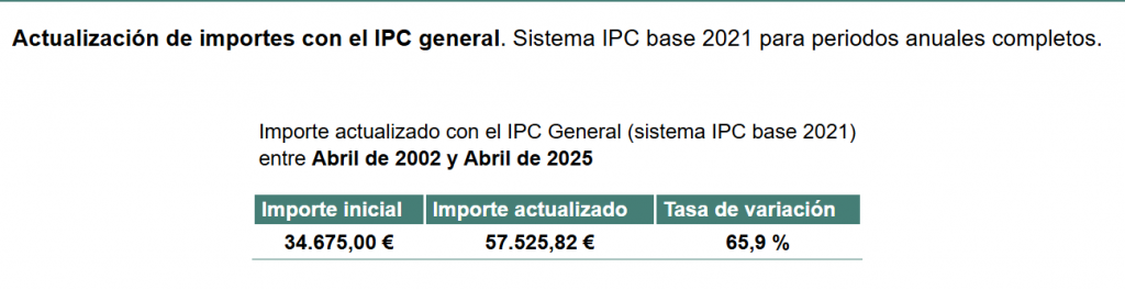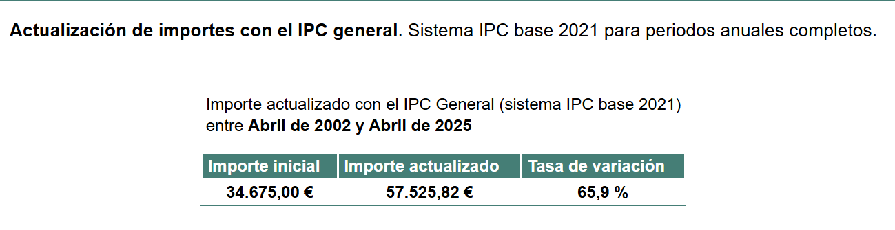 Aunque la calculadora del INE refleja 57.525,82 euros, hay que tener en cuenta que sólo abarca hasta abril de 2025 y no hasta diciembre, de ahí que para mayor seguridad hablemos de menos de 60.000 euros (o algo más de 57.525).