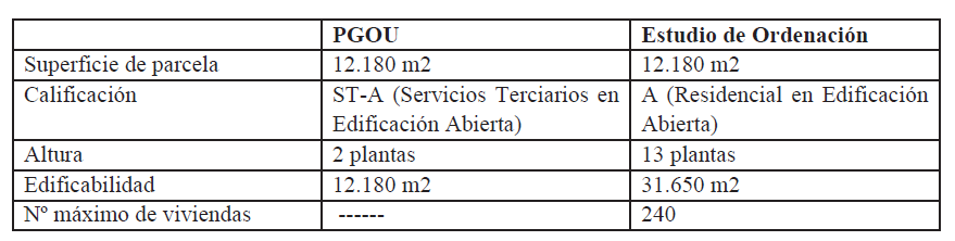 La comparativa de los parámetros urbanísticos existentes, determinados por el vigente