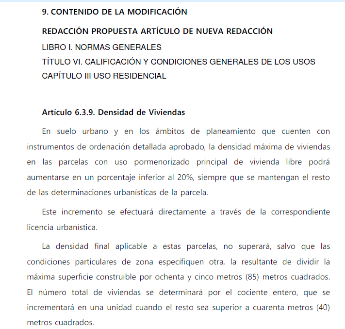 En resumen, según las fuentes consultadas, el cambio fundamental que se pretende con esta modificación del PGOU mediante la introducción de un nuevo artículo en sus Normas es el paso de un modelo rígido y burocrático, que a juicio del gobierno de Sanz genera viviendas de gran tamaño poco adaptadas a la demanda actual, a un modelo flexible y ágil.