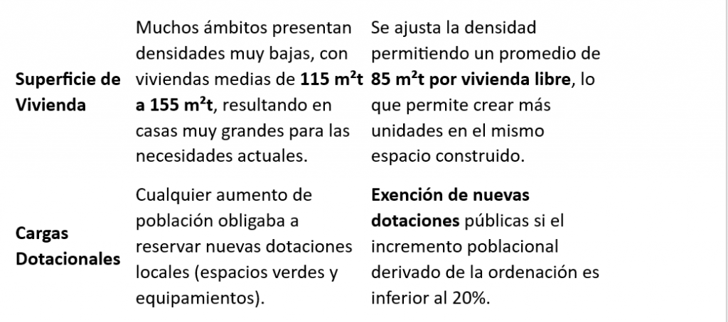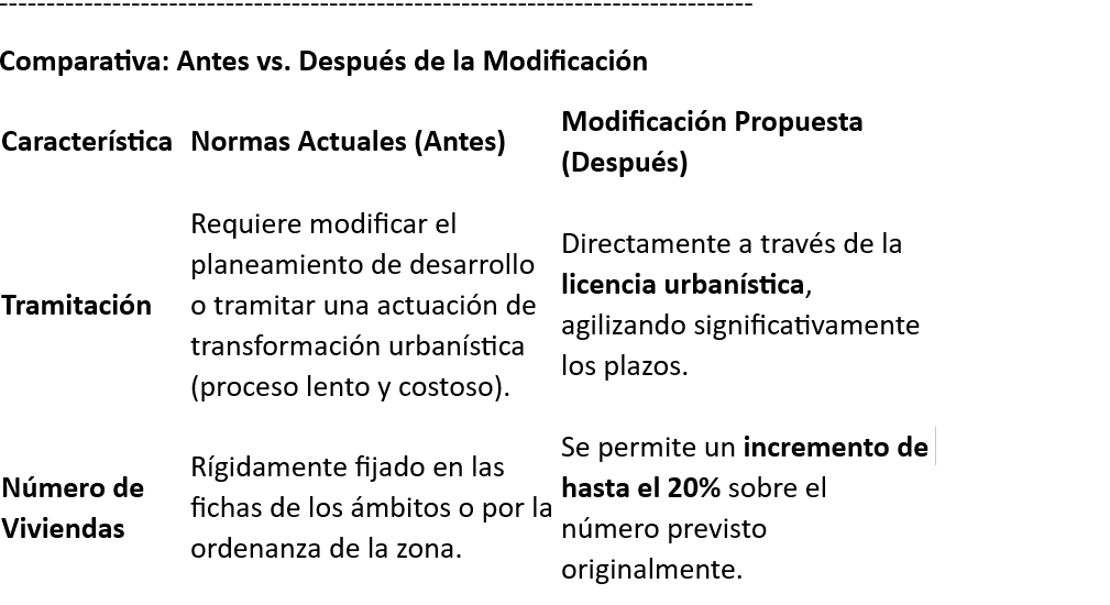 • Procedimiento ágil: El incremento del número de viviendas se podrá obtener directamente mediante la licencia de edificación, sin necesidad de tramitar complejas modificaciones de los instrumentos de planeamiento (como Planes Parciales o Estudios de Ordenación), lo que ahorra tiempo y costes burocráticos.