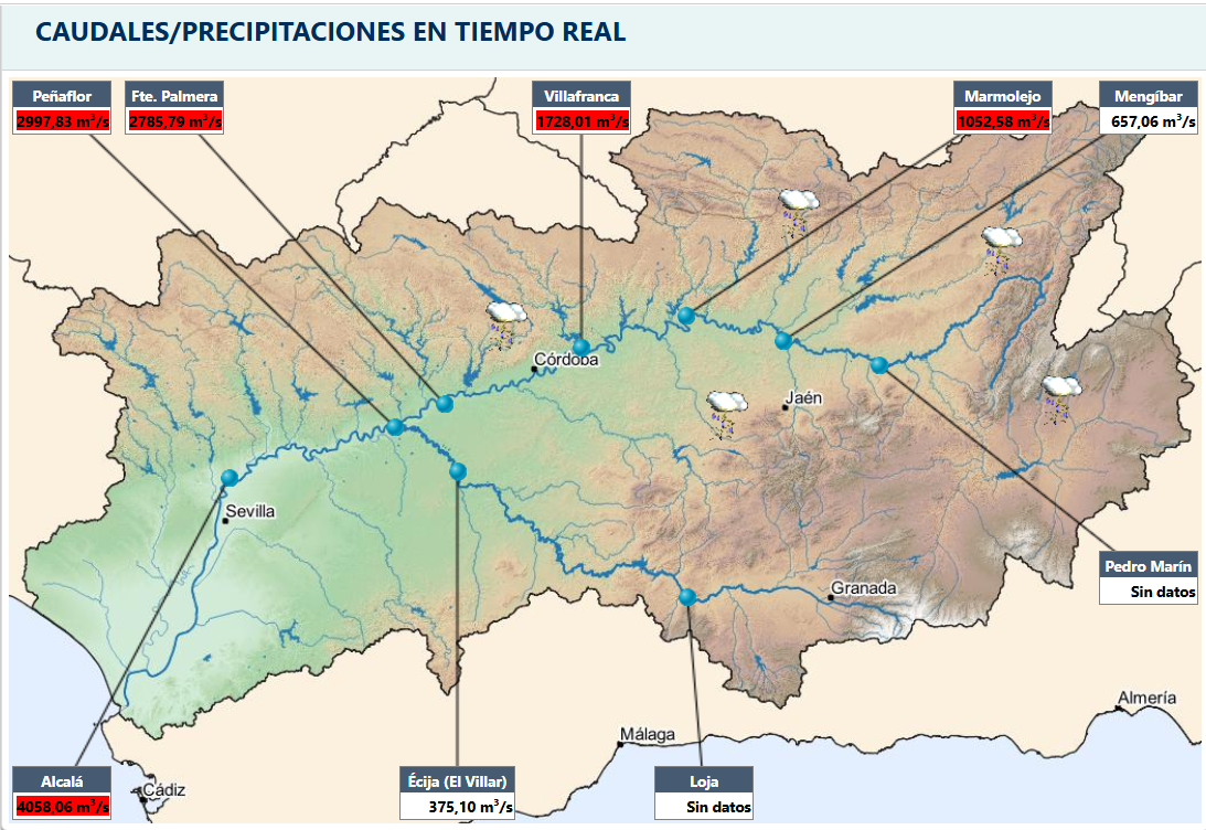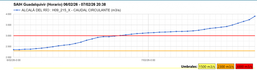 El río Guadalquivir llevaba un caudal de 3.562,82 m3 por segundo a su paso por Alcalá del Río, a unos 17 kilómetros al Norte de Sevilla capital, según una medición realizada hacia las 16:15 horas del sábado 7 de febrero (2026) y que supone un estado de alerta en nivel rojo conforme a los parámetros de la Confederación Hidrográfica. Hacia las 20:30 horas el caudal ya superaba los 4.000 m3/segundo (4.058 m3).