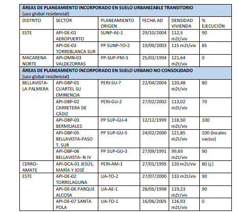 –Áreas de Ejecución al 100%: Sectores como API-DBP-03 Bermejales o API-DM-03 Ronda Norte figuran con un 100% de ejecución. En estos casos, el incremento sólo sería físicamente posible si existen parcelas aún no edificadas o si se acomete un nuevo proyecto de reestructuración que lo permita, ya que la norma se aplica directamente mediante la licencia de edificación.