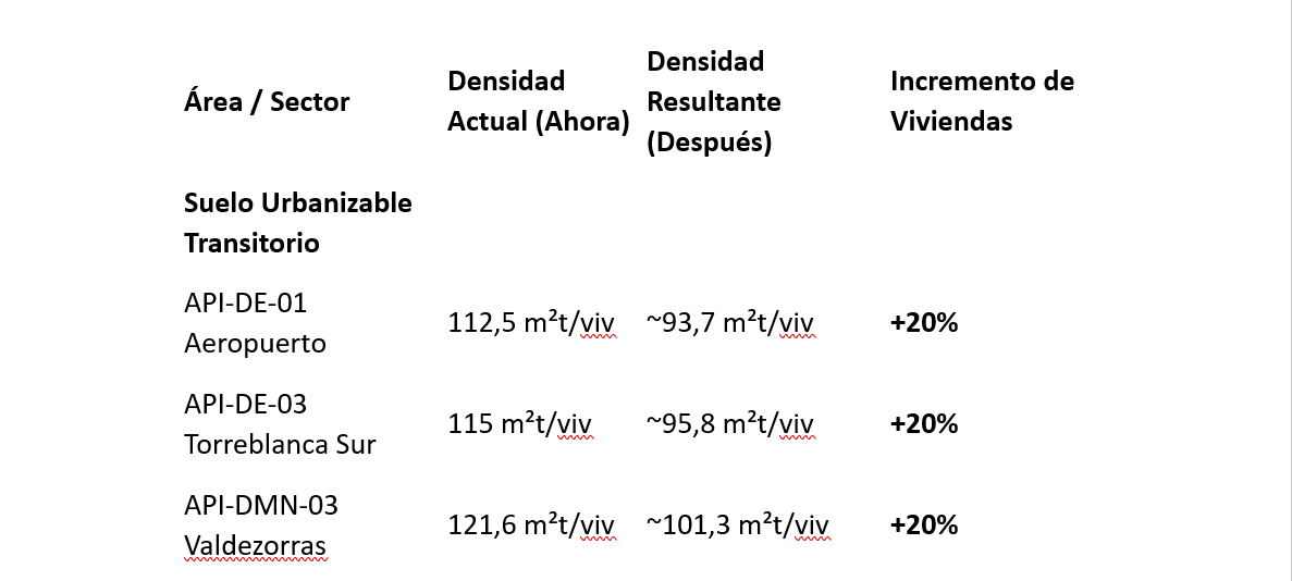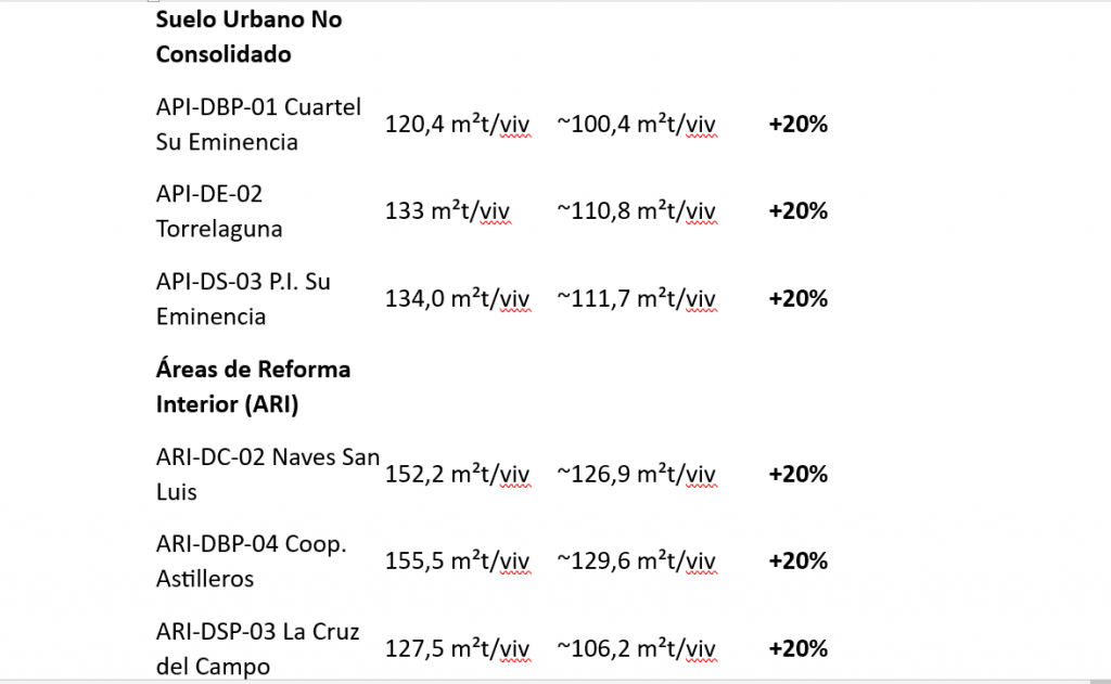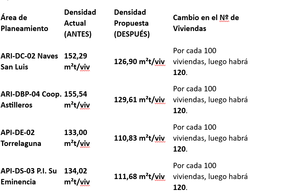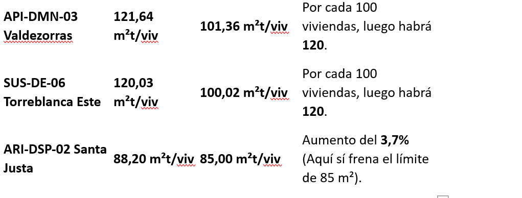 –¿Por qué no todas llegan a 85 m²t? Aunque el artículo propuesto en la Modificación Puntual permite bajar hasta los 85 m²t, si un sector tiene actualmente 150 m²t/viv, bajar a 85 m²t supondría un aumento de casi el 76% en el número de viviendas. Como el Reglamento de la LISTA y la propia modificación prohíben superar un incremento del 20% para acogerse a la tramitación ágil sin nuevas cargas dotacionales, estas áreas se quedarán en un aumento del 20%.