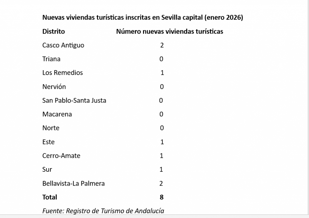 Ocho viviendas de uso turístico (VUT) radicadas en Sevilla capital fueron inscritas en el Registro Oficial de Turismo de la Junta de Andalucía durante el mes de enero de 2026. Se trata del número mensual más bajo desde que José Luis Sanz tomó posesión como alcalde hispalense en junio del año 2023.