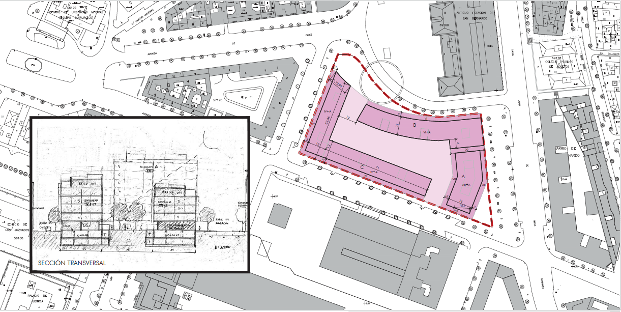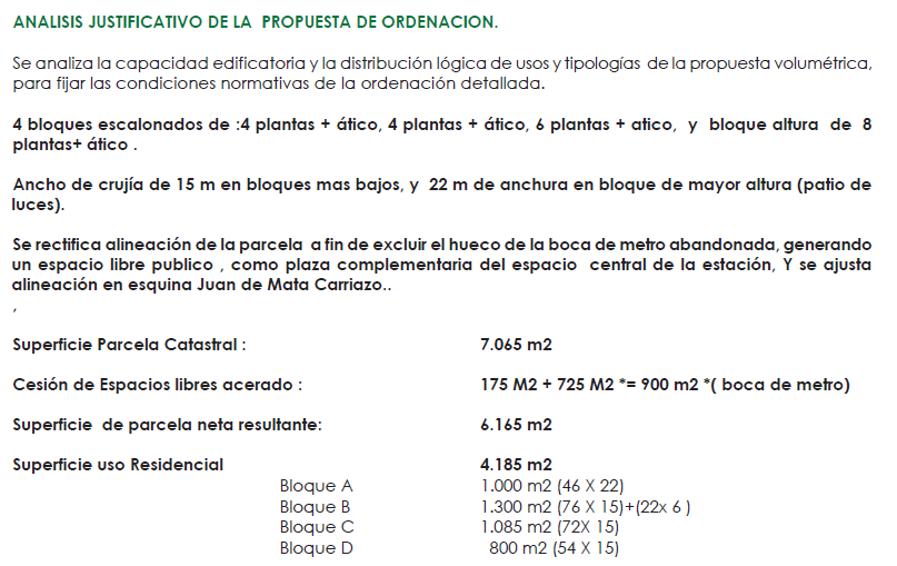 Además de las cesiones dotacionales expuestas, esta alternativa ordena con usos residenciales en volúmenes lineales continuos los frentes de fachada hacia la plaza semicircular de la estación, con altura continua de 6 plantas más ático; y el frente hacia la Calle Juan de Mata Carriazo, con altura continua de 8 plantas más ático.