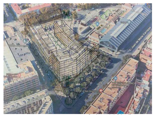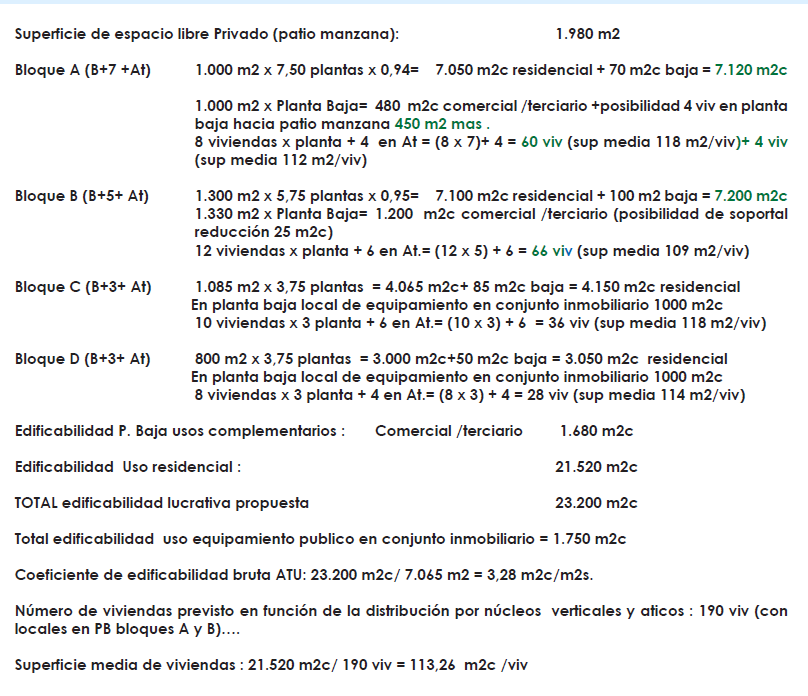 Además se incluye la edificabilidad de uso de equipamiento en conjunto inmobiliario de 1.750 m2c , en planta baja. Para mejorar las condiciones ambientales del espacio libre privado interior, patio de manzana, (ventilación, soleamiento , percepción visual mas rica en contrastes, , etc),se proponen dos aberturas de la continuidad del perímetro edificado : la primera, como espacio de entrada al conjunto desde el espacio libre generado en el retranqueo de la antigua estación de Metro; y la segunda, en el frente de la Avda. de Málaga, en los puntos de transición de las distintas alturas de la edificación propuestas.