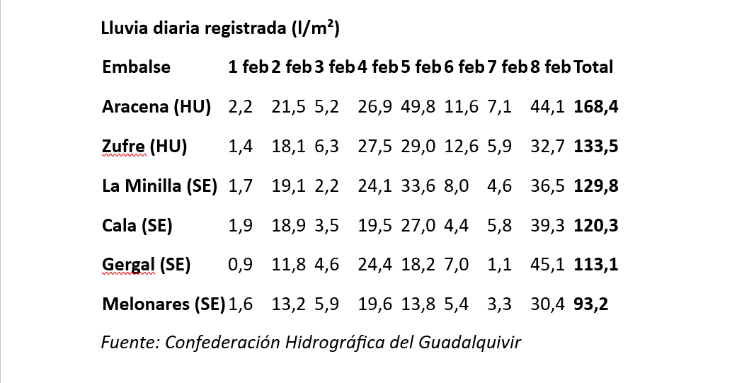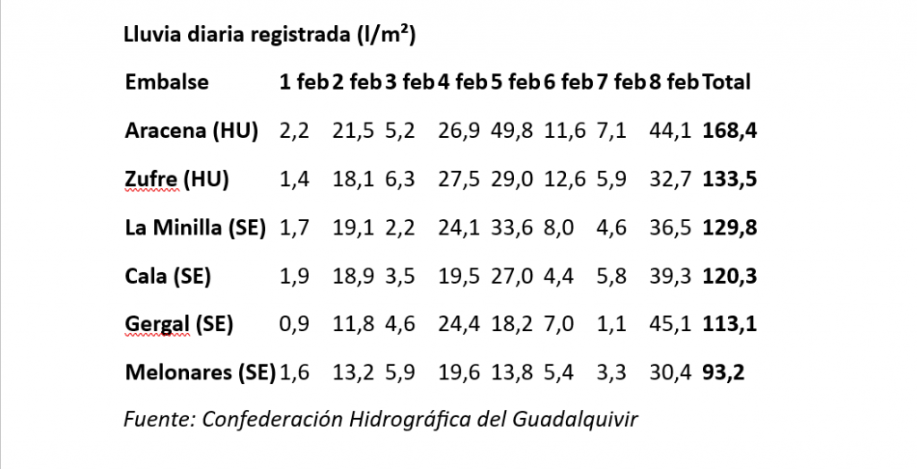 • Puebla de Cazalla: 230,5 l/m² (con un máximo de 90,7 l/m² el 5 de febrero).