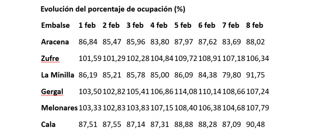 La saturación máxima se alcanzó de forma generalizada entre el 5 y el 6 de febrero. Destaca el embalse del Gergal, que llegó a estar al 114,08% de su capacidad el día 5.