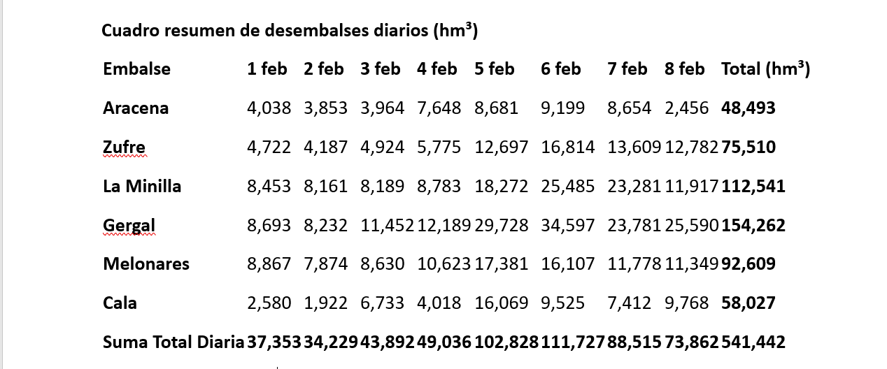 –Volumen total desembalsado (1-8 de febrero): 541,442 hm³.