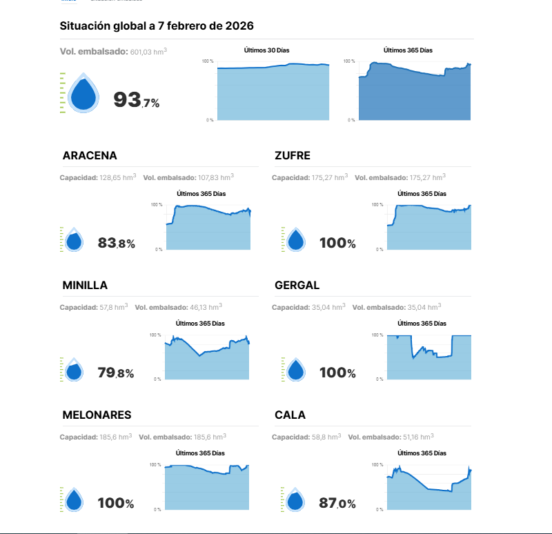Los seis pantanos de la empresa metropolitana de abastecimiento y saneamiento (Emasesa) que da servicio a Sevilla capital y parte de su área metropolitana almacenan a fecha 7 de febrero (2026) un total de 601,03 hm3, cantidad equivalente al 93,7% de su capacidad conjunta. Aunque se ha dicho, incluso desde el gobierno local hispalense, que todos están al 100% desde hace días y desaguando, en realidad Emasesa sólo ha dejado que se llenen los de Zufre, Gergal y Melonares, tal como han reflejado sus estadísticas a lo largo de la última semana.