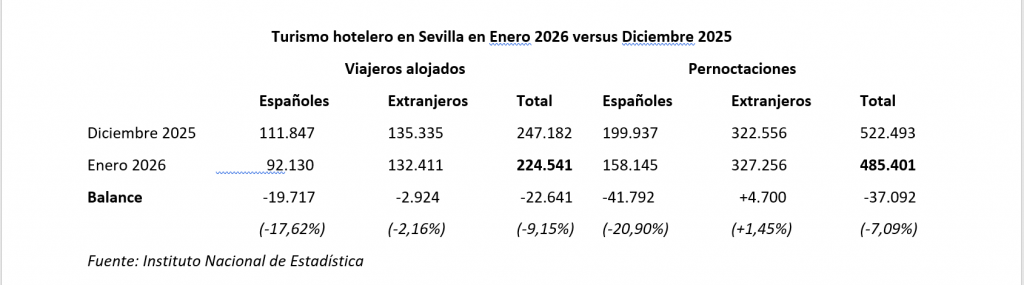Si se compara la Encuesta de Ocupación Hotelera de enero de 2026 con la de diciembre de 2025 se observa una caída del 9,15% en el número de viajeros alojados en los establecimientos sevillanos y del 7,09% en el número de pernoctaciones.