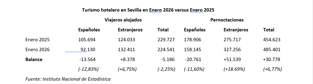 Si se mira el balance interanual, es decir la estadística de enero de 2026 y la de enero de 2025, ya se aprecia con mayor nitidez cómo la fortaleza del turismo internacional que capta Sevilla ha paliado el impacto negativo del accidente ferroviario al compensar o minimizar la caída de los indicadores referidos al turismo de origen nacional.