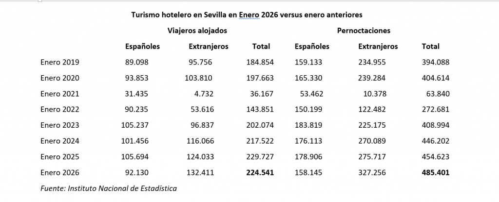 A la hora de hacer un análisis lo más objetivo posible hay que tener en cuenta que enero ha sido el peor mes en número de viajeros alojados en hoteles de Sevilla capital y en número de pernoctaciones realizadas por aquéllos en al menos los tres últimos años (2023, 2024 y 2025) de la serie histórica reciente, por lo que «a priori» no podía esperarse demasiado de enero de 2026 aunque no se hubiese producido el accidente de Adamuz. Lógicamente, la tragedia ha contribuido a empeorar una estadística que según las expectativas previas no iba a ser tan buena en comparación con las potenciales de los meses que restan del año en curso y en función de los antecedentes.