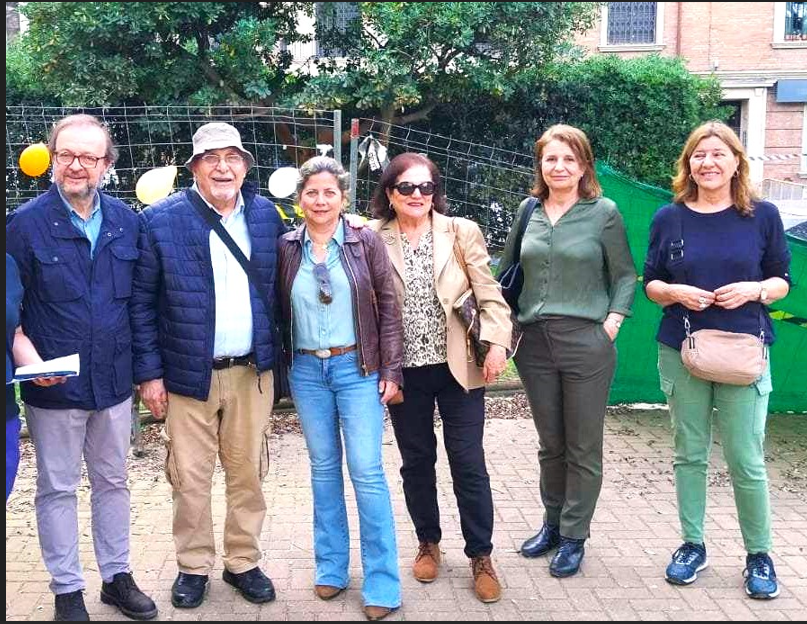Pablo (primero por la izquierda), con otros miembros de la familia Ferrand en la merienda-protesta organizada por la asociación de amigos de los Jardines de la Oliva el 8 de abril de 2025 por la mutilación en Los Remedios de los jardines dedicados a su padre, Manuel Ferrand