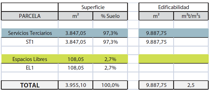 De acuerdo a estas condiciones, considerando la superficie de la parcela, a ésta le correspondería una edificabilidad total de 9.887,75 m2t.