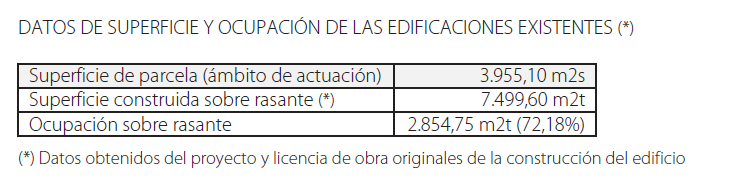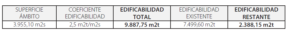 Dicha edificabilidad total es superior a la actualmente existente dentro del ámbito (7.499,60 m2t) de acuerdo a los datos del proyecto original de construcción del edificio, por lo que quedaría una edificabilidad remanente restante de 2.388,15 m2t.