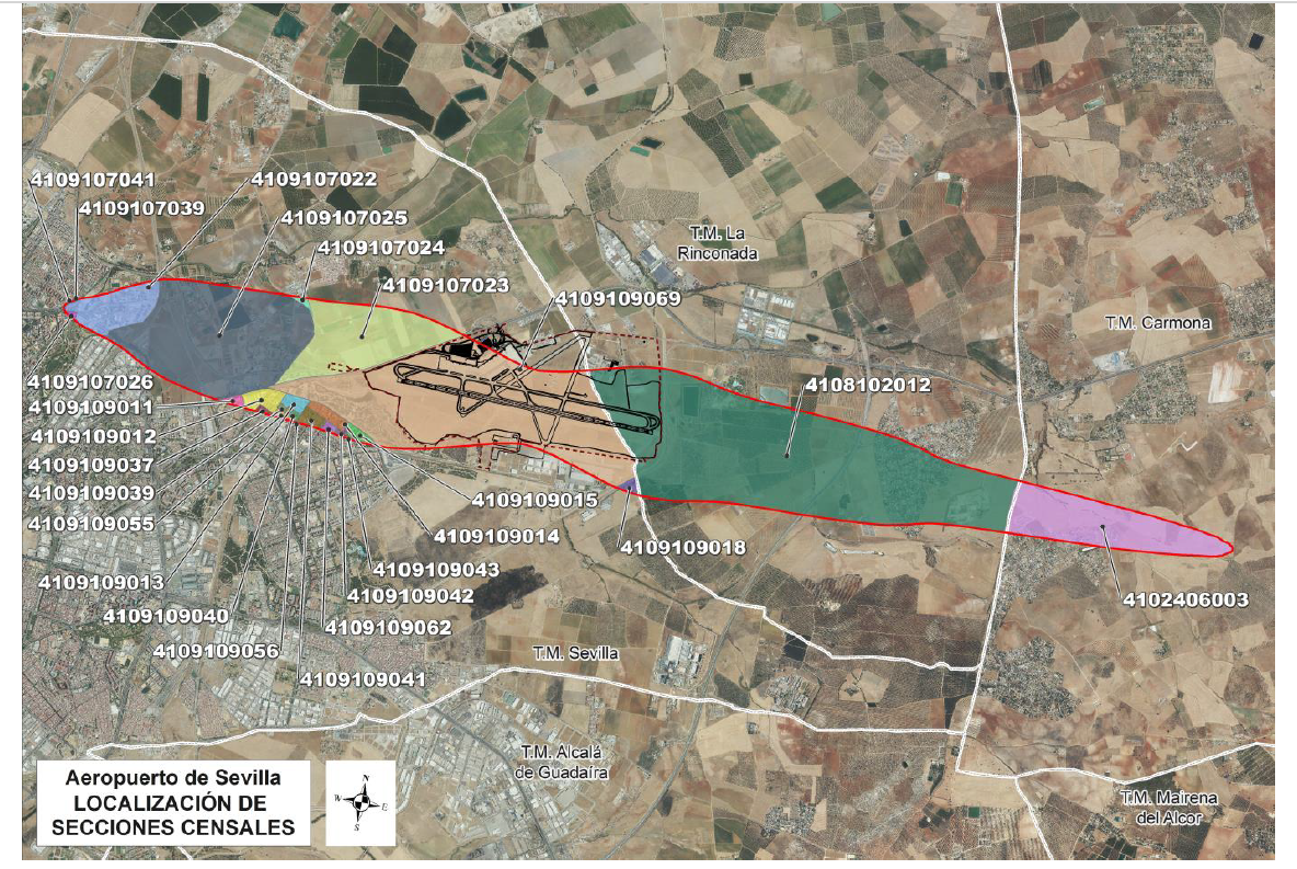 El «Mapa de Ruidos del Aeropuerto de Sevilla (Anexo VII)» identifica las secciones censales de la ciudad que se encuentran dentro del ámbito de estudio por su afección acústica. Las secciones de Sevilla delimitadas bajo esta huella de ruido son: