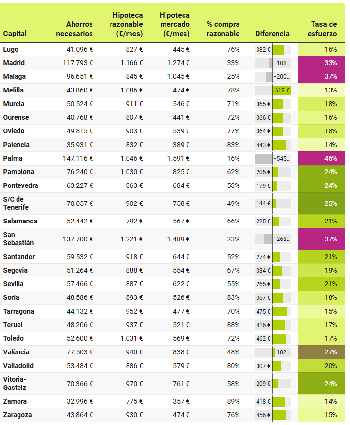 Peso de la tipología de una vivienda tipo (piso de 2 habitaciones) en venta a un precio razonable por capitales de provincia. Un precio razonable supondría la cuota hipotecaria máxima que una familia de ingresos medios podría pagar para no destinar más del 30% de sus ingresos al pago de la hipoteca mensual. Se añaden los ahorros previos para poder adquirir la propiedad y la diferencia con la cuota hipotecaria de la misma vivienda a precio de mercado.